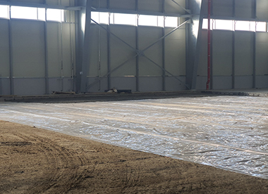 1. 정리된 지반 위에 별도의 비림 콘크리트 없이 P.E film 깔기 작업을 한다.