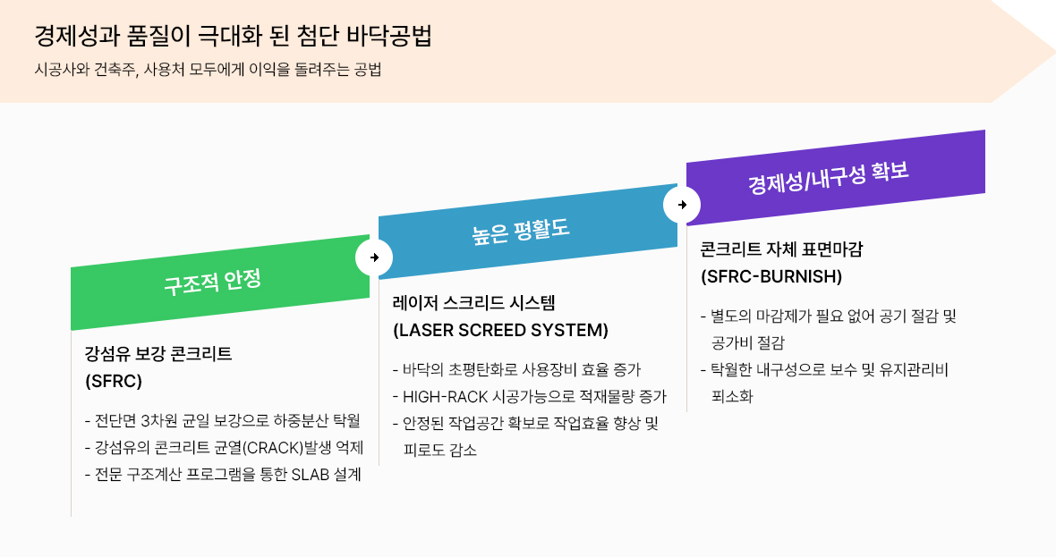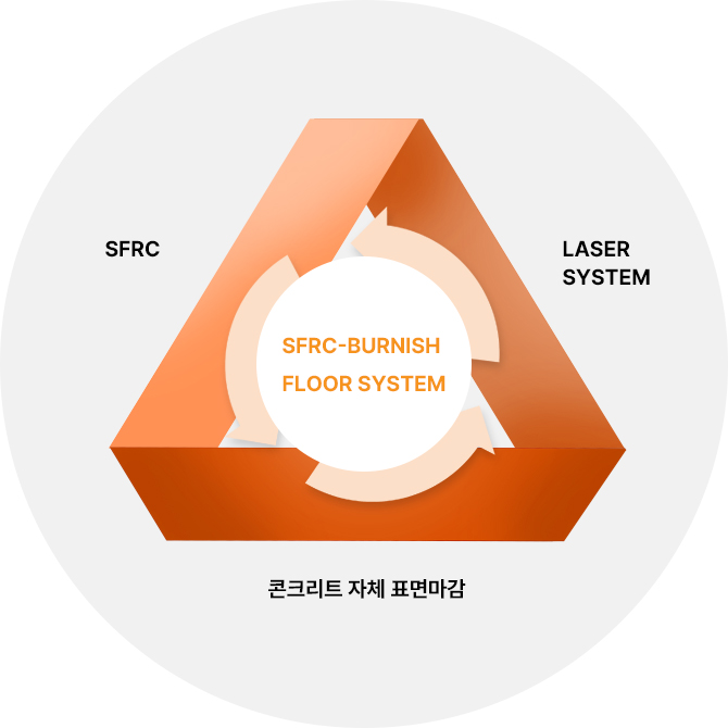 • 기존 RC(Rainforced Concrete) SLAB 구조에서 철근을 대신해 강섬유(Steel Fiber)를 보강한 강섬유 보강 콘크리트(Steel Fiber Rainforced Concrete, SFRC) 구조의 SLAB 신공법으로, 높은 수준의 평활도 확보를 위하여 LASER SYSTEM에 의해 콘크리트 타설면을 제어하고 별도의 마감재 없이 콘크리트 자체 표면감도를 극대화 시키는 방법(BURNISH)으로 마감하는 공법을 말한다.